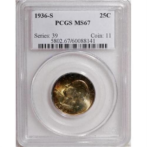 <B>1936-S 25C MS67 PCGS.</B></I> Bright lemon-gold, ruby-red, and aqua-marine patina consumes the obverse, while the reverse is brilliant aside from a band of pale tan color along the left border. A lustrous and well preserved Superb Gem. A lower mintage issue with fewer than 4 million pieces struck. Suitable for the finest quality Registry Set. Population: 21 in 67, 0 finer (6/07).<BR><BR><B>Coin Engraver:</B> John Flanagan<BR><BR><b>Shipping:</b> Coins & Currency (<a target="_blank" href="http://www.heritageauctions.com/common/shipping.php">view shipping information</a>\)