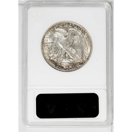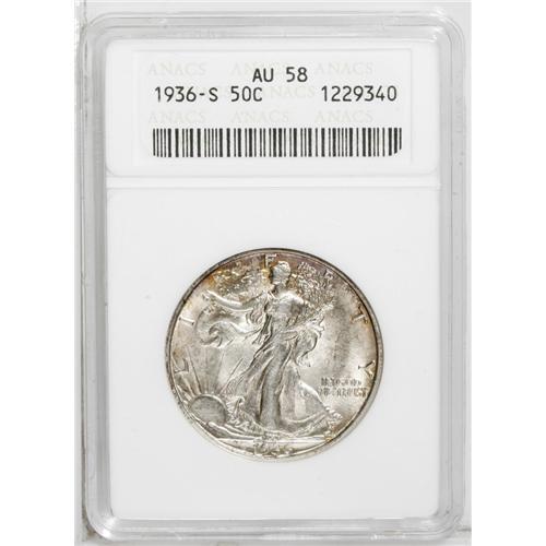 <B>1936-S<50C> AU58 ANACS.</B></I> A hint of highpoint friction keeps this lustrous piece from Mint State. Nicely struck with untoned centers and gold and red patina at the periphery.