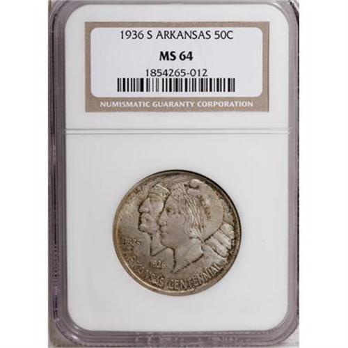 <B>1936-S 50C Arkansas MS64 NGC.</B></I> NGC Census: (321/380). PCGS Population (496/441). Mintage: 9,662. Numismedia Wsl. Price for NGC/PCGS coin in MS64: $100. (#9239)<BR><I>From The Frank DuVall Collection of U.S. Commemoratives.</B></I><BR><BR><b>Shipping:</b> Coins & Currency (<a target="_blank" href="http://www.heritageauctions.com/common/shipping.php">view shipping information</a>\)
