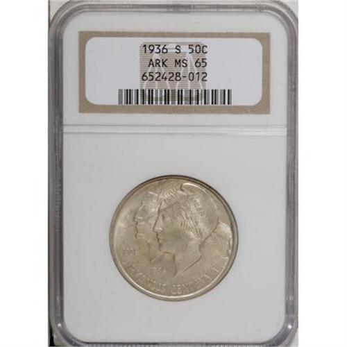 <B>1936-S 50C Arkansas MS65 NGC.</B></I> . NGC Census: (321/68). PCGS Population (319/136). Mintage: 9,662. Numismedia Wsl. Price for NGC/PCGS coin in MS65: $224. (#9239)<BR><BR><b>Shipping:</b> Coins & Currency (<a target="_blank" href="http://www.heritageauctions.com/common/shipping.php">view shipping information</a>)