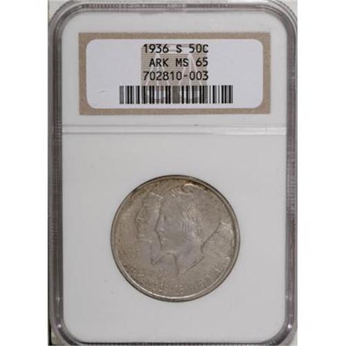 <B>1936-S 50C Arkansas MS65 NGC.</B></I> . NGC Census: (321/68). PCGS Population (319/136). Mintage: 9,662. Numismedia Wsl. Price for NGC/PCGS coin in MS65: $224. (#9239)<BR><BR><b>Shipping:</b> Coins & Currency (<a target="_blank" href="http://www.heritageauctions.com/common/shipping.php">view shipping information</a>)
