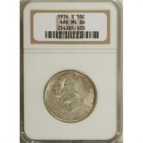 <B>1936-S 50C Arkansas MS66 NGC.</B></I> Delicate ice-blue and lavender patina graces both sides of this S-mint Arkansas half, and the upper reverse periphery shows elements of gold-orange as well. Solidly struck and carefully preserved. Census: 55 in 66, 4 finer (7/07).<BR><BR><b>Shipping:</b> Coins & Currency (<a target="_blank" href="http://www.heritageauctions.com/common/shipping.php">view shipping information</a>)