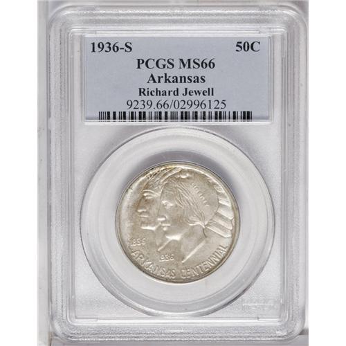 <B>1936-S<50C> Arkansas MS66 PCGS.</B></I> Ex: Richard Jewell. Delicate ocean-blue and gold toning visits this satiny and unmarked Premium Gem. A scant seven pieces have been certified finer by PCGS (4/06).