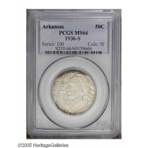 1936-S 50C Arkansas MS66 PCGS. Mottled golden-brown to 1936-S[50C] Arkansas MS66 PCGS.