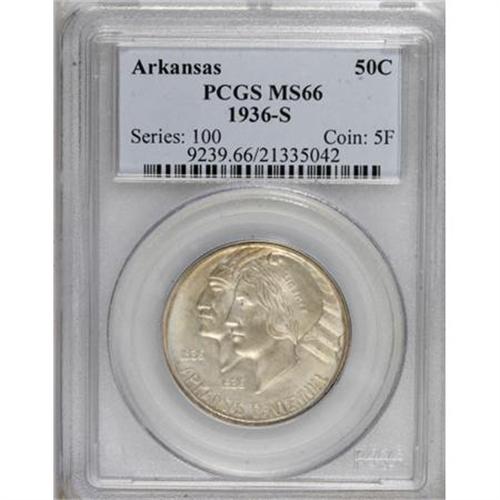 <B>1936-S 50C Arkansas MS66 PCGS.</B></I> PCGS Population (125/7). NGC Census: (59/4). Mintage: 9,662. Numismedia Wsl. Price for NGC/PCGS coin in MS66: $600. (#9239)<BR><BR><b>Shipping:</b> Coins & Currency (<a target="_blank" href="http://www.heritageauctions.com/common/shipping.php">view shipping information</a>)