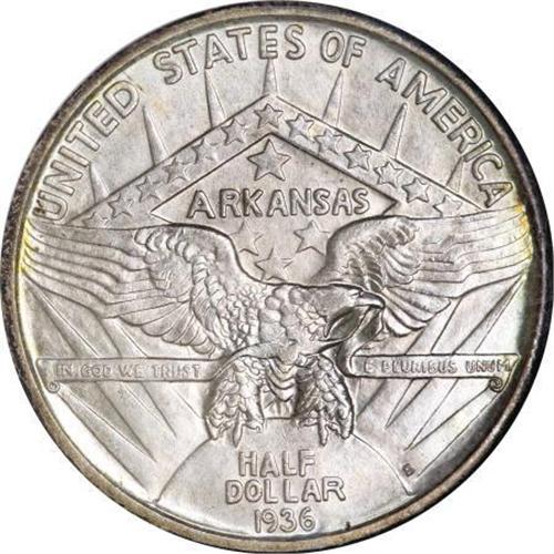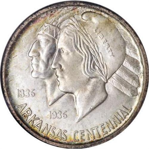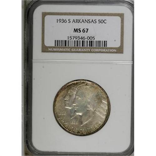 <B>1936-S 50C Arkansas MS67 NGC.</B></I> A thin peripheral crescent of amber and magenta complements the silver-gold centers of this magnificent Superb Gem, which shows precious few contact marks of any size, even under a high-power loupe. The strike is bold and pleasing, even at the often-weak center reverse. This piece at MS67 is among the finest certified at either NGC or PCGS. Census: 6 in 67, 0 finer (1/08).<BR><BR><b>Shipping:</b> Coins & Currency (<a target="_blank" href="http://www.heritageauctions.com/common/shipping.php">view shipping information</a>)