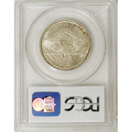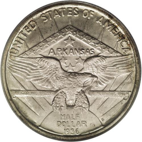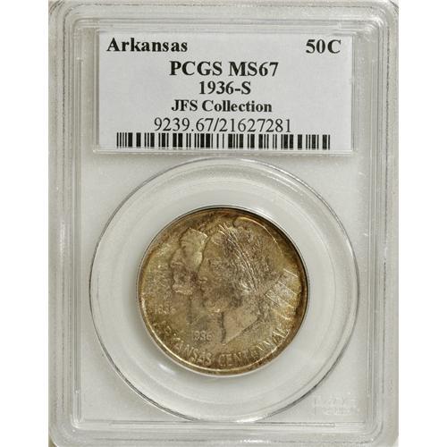 <B>1936-S 50C Arkansas MS67 PCGS.</B></I> Ex: JFS Collection. While the event celebrated was worthy, at least by the standards of previous silver commemoratives, the array of dates and mintmarks was not; Q. David Bowers (1991) noted that if the Arkansas centennial had been the only reason for celebration, coinage began a year early and ended three years too late! A rich coating of dappled olive, russet, and crimson patina blankets the obverse, while the reverse remains essentially untoned. A seemingly pristine example of this low-mintage issue, tied for the finest certified by either NGC or PCGS (3/07).<BR><I>From The Cary & Cheryl Porter Collection.</B></I><BR><BR><b>Shipping:</b> Coins & Currency (<a target="_blank" href="http://www.heritageauctions.com/common/shipping.php">view shipping information</a>)