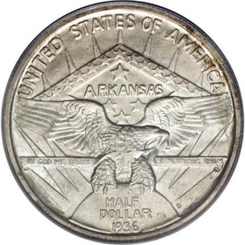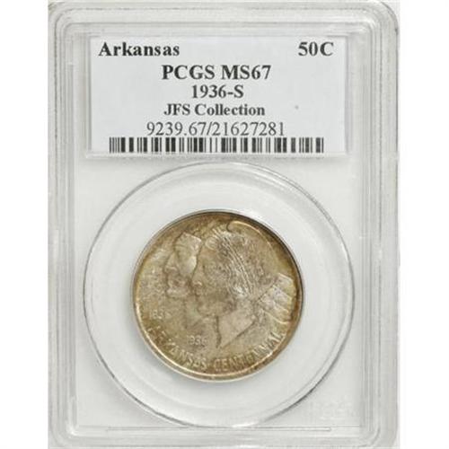 <B>1936-S 50C Arkansas MS67 PCGS.</B></I> Ex: JFS Collection. Walter Breen's cryptic musings about Confederate symbolism notwithstanding, the Arkansas half presents itself as a straightforward, if uninspired celebration of that state's centennial. A rich coating of dappled olive, russet, and crimson patina blankets the obverse, while the reverse remains essentially untoned. A seemingly pristine example of this low-mintage issue, tied for the finest certified by either NGC or PCGS (11/07).<BR><BR><b>Shipping:</b> Coins & Currency (<a target="_blank" href="http://www.heritageauctions.com/common/shipping.php">view shipping information</a>)