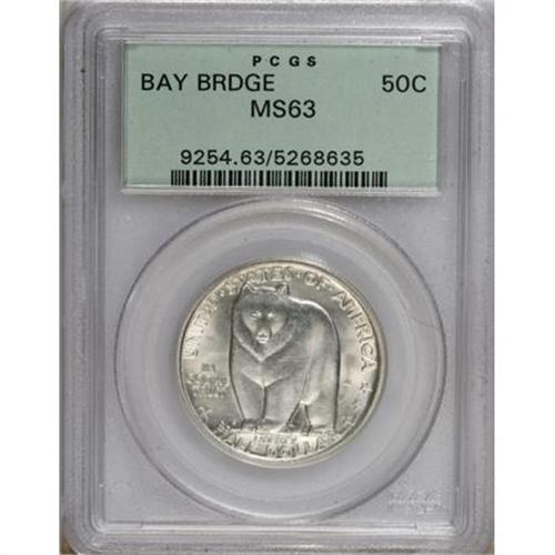 <B>1936-S 50C Bay Bridge MS63 PCGS.</B></I> PCGS Population (736/3872). NGC Census: (165/2663). Mintage: 71,424. Numismedia Wsl. Price for NGC/PCGS coin in MS63: $154. (#9254)<BR><BR><b>Shipping:</b> Coins & Currency (<a target="_blank" href="http://www.heritageauctions.com/common/shipping.php">view shipping information</a>)
