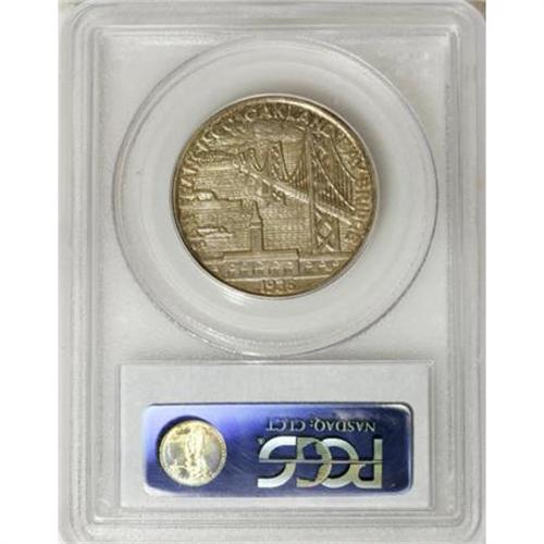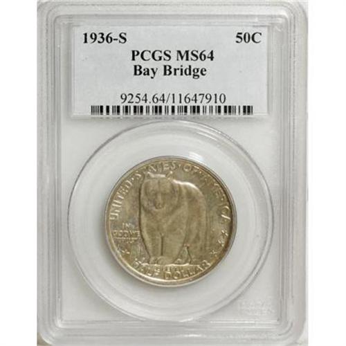 <B>1936-S 50C Bay Bridge MS64 PCGS.</B></I> PCGS Population (1622/2248). NGC Census: (874/1790). Mintage: 71,424. Numismedia Wsl. Price for NGC/PCGS coin in MS64: $172. (#9254)<BR><BR><b>Shipping:</b> Coins & Currency (<a target="_blank" href="http://www.heritageauctions.com/common/shipping.php">view shipping information</a>)