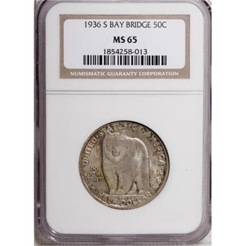 <B>1936-S 50C Bay Bridge MS65 NGC.</B></I> NGC Census: (1218/564). PCGS Population (1413/815). Mintage: 71,424. Numismedia Wsl. Price for NGC/PCGS coin in MS65: $292. (#9254)<BR><I>From The Frank DuVall Collection of U.S. Commemoratives.</B></I><BR><BR><b>Shipping:</b> Coins & Currency (<a target="_blank" href="http://www.heritageauctions.com/common/shipping.php">view shipping information</a>\)