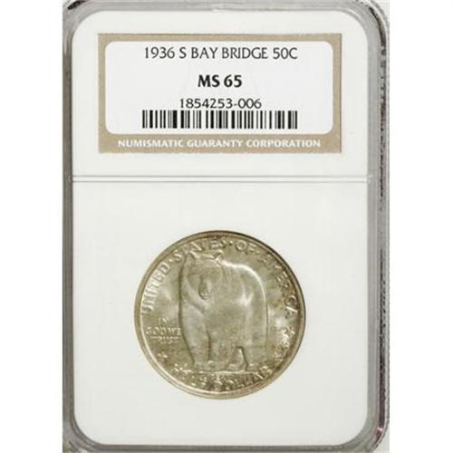 <B>1936-S 50C Bay Bridge MS65 NGC.</B></I> NGC Census: (1218/564). PCGS Population (1413/815). Mintage: 71,424. Numismedia Wsl. Price for NGC/PCGS coin in MS65: $292. (#9254)<BR><I>From The Frank DuVall Collection of U.S. Commemoratives.</B></I><BR><BR><b>Shipping:</b> Coins & Currency (<a target="_blank" href="http://www.heritageauctions.com/common/shipping.php">view shipping information</a>\)