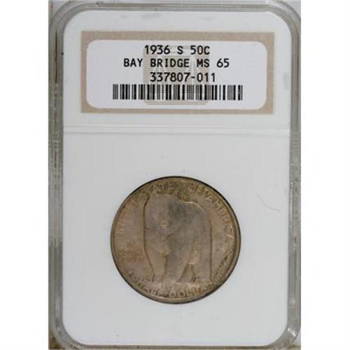<B>1936-S 50C Bay Bridge MS65 NGC.</B></I> NGC Census: (1224/568). PCGS Population (1446/821). Mintage: 71,424. Numismedia Wsl. Price for NGC/PCGS coin in MS65: $292. (#9254)<BR><BR><b>Shipping:</b> Coins & Currency (<a target="_blank" href="http://www.heritageauctions.com/common/shipping.php">view shipping information</a>)