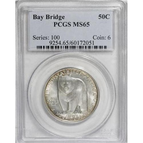 <B>1936-S 50C Bay Bridge MS65 PCGS.</B></I> PCGS Population (1413/815). NGC Census: (1218/564). Mintage: 71,424. Numismedia Wsl. Price for NGC/PCGS coin in MS65: $292. (#9254)<BR><BR><b>Shipping:</b> Coins & Currency (<a target="_blank" href="http://www.heritageauctions.com/common/shipping.php">view shipping information</a>)
