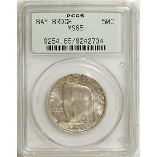 <B>1936-S 50C Bay Bridge MS65 PCGS.</B></I> PCGS Population (1430/818). NGC Census: (1223/567). Mintage: 71,424. Numismedia Wsl. Price for NGC/PCGS coin in MS65: $292. (#9254)<BR><BR><b>Shipping:</b> Coins & Currency (<a target="_blank" href="http://www.heritageauctions.com/common/shipping.php">view shipping information</a>)