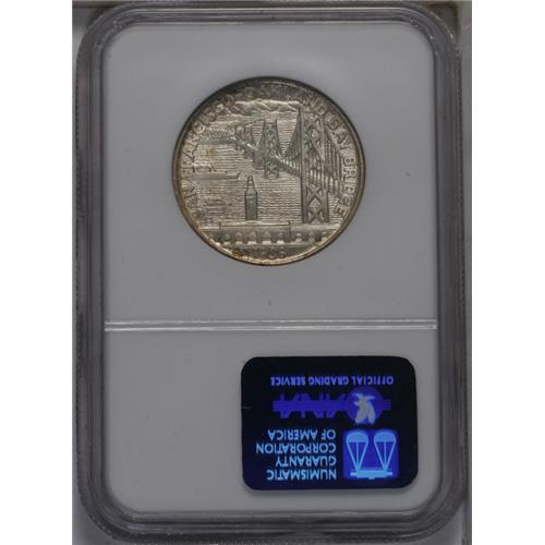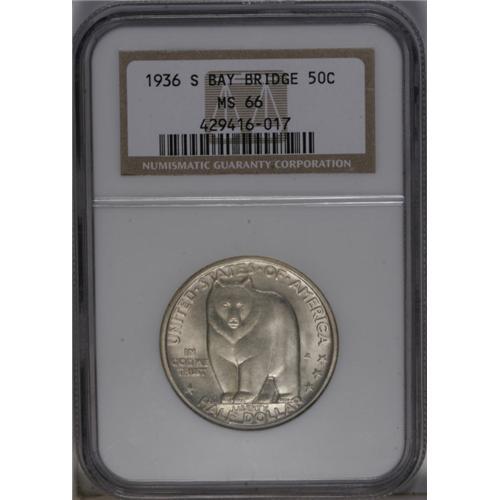 <B>1936-S<50C> Bay Bridge MS66 NGC.</B></I> A delightful Gem with frosty silver luster and sharp design details. Both sides have light ivory color with a few small splashes of dark golden-brown toning on the reverse.