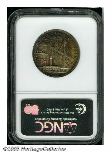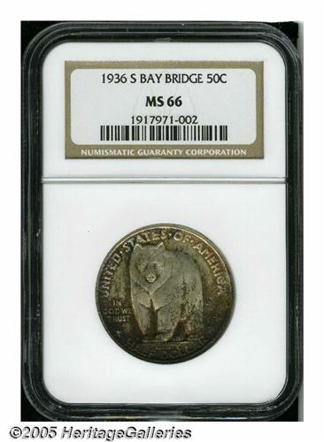 <B>1936-S<50C> Bay Bridge MS66 NGC.</B></I> This popular Bay Bridge commemorative displays swaths of deep purple, crimson, greenish-gold, forest-green, and orange patina that overlay lustrous surfaces. Excellent definition is seen on the design elements, and the surfaces are well preserved on both sides. A couple of trivial marks on the bear's forelegs do not distract.