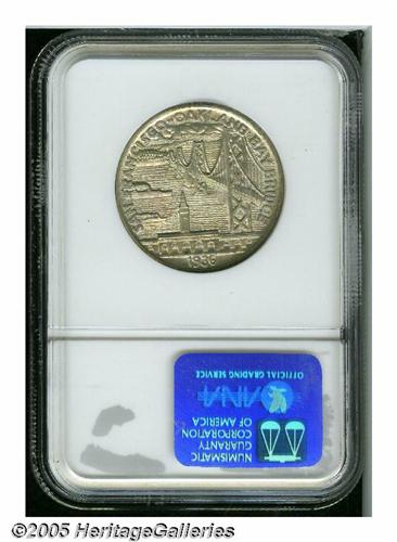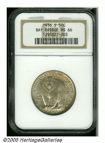 <B>1936-S<50C> Bay Bridge MS66 NGC.</B></I> Well struck with gleaming satin luster and lovely steel-blue and champagne-gray coloration. A few scattered surface nicks prevent an even loftier grade designation for this appealing Premium Gem.