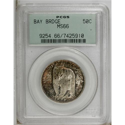 <B>1936-S 50C Bay Bridge MS66 PCGS.</B></I> Dappled auburn, crimson, and silver-gray patina covers this luminous Premium Gem. The simple design displays excellent detail.<BR><BR><b>Shipping:</b> Coin/Currency (<a target="_blank" href="http://www.heritageauctions.com/common/shipping.php">view shipping information</a>)