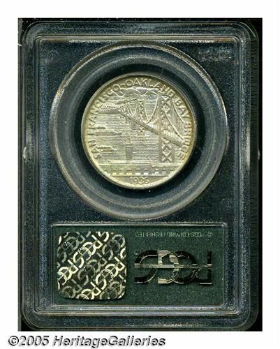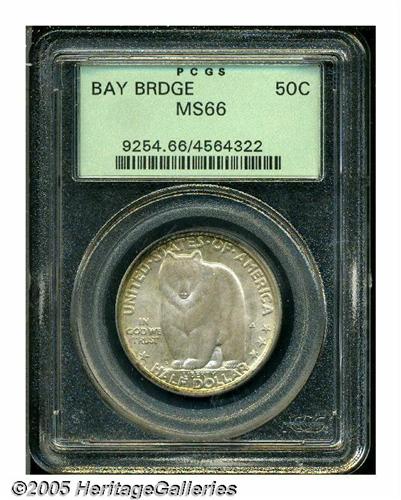 <B>1936-S<50C> Bay Bridge MS66 PCGS.</B></I> Well struck and satiny, with near-pristine surfaces and lovely light toning, which appears to be entirely original. A visually superior premium Gem.