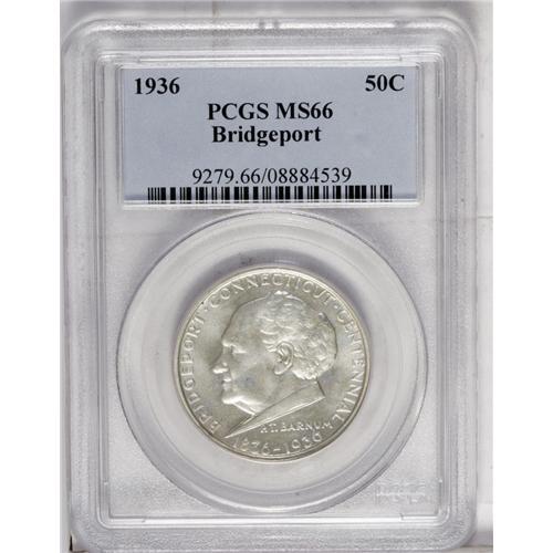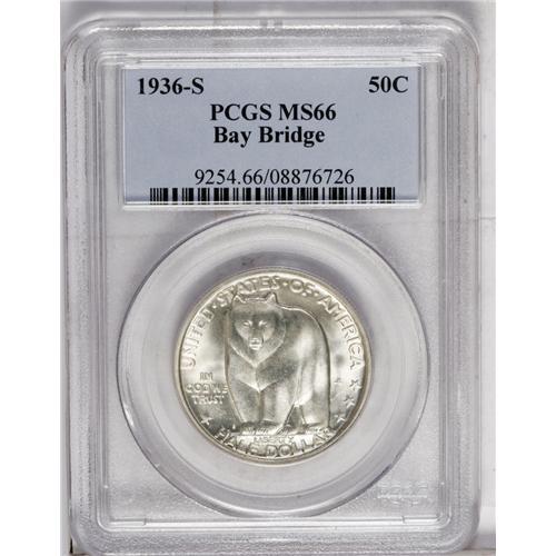 <B>1936-S<50C> Bay Bridge MS66 PCGS,</B></I> a champagne-toned piece with nice luster and well-defined devices; and a <B>1936<50C> Bridgeport MS66 PCGS,</B></I> solidly struck with hazy patina that partly masks strong luster.