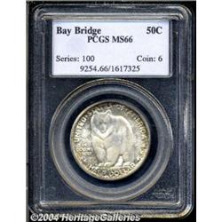 <B>1936-S<50C> Bay Bridge MS66 PCGS.</B></I> Mottled russet patination is seen in all areas save for the central obverse. Fully original with hardly any abrasions in evidence. <BR><BR><B>Important notice:</B> Heritage usually auctions material at the rate of 200-250 lots per hour. On some occasions eBay Live bid software or the Internet may not be able to keep up with the pace of the auction. We recommend placing a realistic absentee bid now as insurance to avoid disappointment. Occasionally the auctioneer may eliminate or reject an eBay Live bid, and the auctioneer may also reopen a lot after the close of the eBay live bidding (usually because we missed an audience bid), and may reject your bid even if it shows you as the winning bidder. By bidding via eBay Live, you agree that Heritage may award the lot to another bidder at its sole discretion under the circumstances described above or any other reasonable circumstances. Since eBay bids are not shown to us until we open the lot on the floor, we treat those bids just like floor bids. In most cases the floor responds before the eBay bid is presented to us, due to Internet lag time, so for consistency we have made it a policy that floor bids are always considered first over tie eBay live bids. Also please note that all Heritage lots purchased through eBay Live carry a 20% Buyer's Premium. Please make sure you read the Terms and Conditions before you bid.