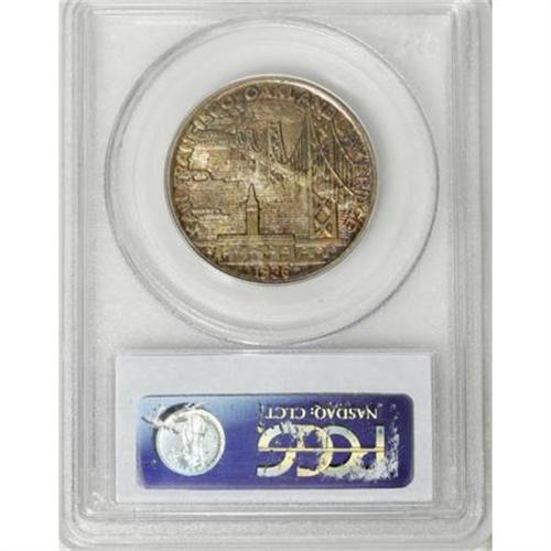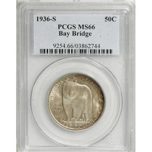 <B>1936-S 50C Bay Bridge MS66 PCGS.</B></I> . PCGS Population (705/115). NGC Census: (498/76). Mintage: 71,424. Numismedia Wsl. Price for NGC/PCGS coin in MS66: $510. (#9254)<BR><BR><b>Shipping:</b> Coins & Currency (<a target="_blank" href="http://www.heritageauctions.com/common/shipping.php">view shipping information</a>)