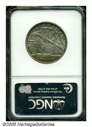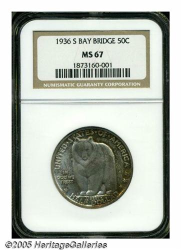 <B>1936-S<50C> Bay Bridge MS67 NGC.</B></I> Mottled deep russet and gold sit over silver-gray surfaces. A few faint handling marks are evident on the obverse. Superlative preservation and quality are the hallmarks of this example.