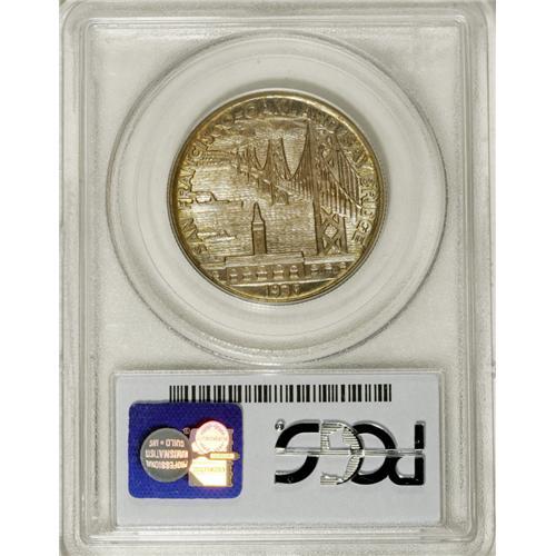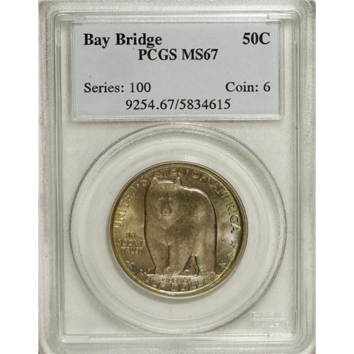 <B>1936-S 50C Bay Bridge MS67 PCGS.</B></I> Heather-blue patina covers most of this Superb Gem, while a thin ring of greenish-gold toning hugs the rims. Well-preserved with a strong strike and suitable luster. PCGS has certified only nine coins finer (1/07).<BR><BR><b>Shipping:</b> Coins & Currency (<a target="_blank" href="http://www.heritageauctions.com/common/shipping.php">view shipping information</a>)