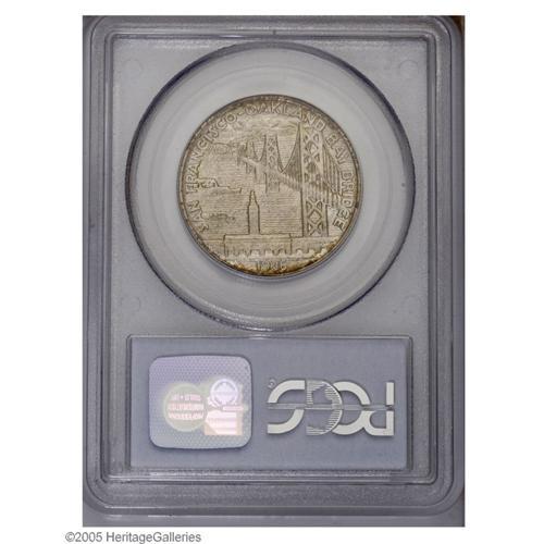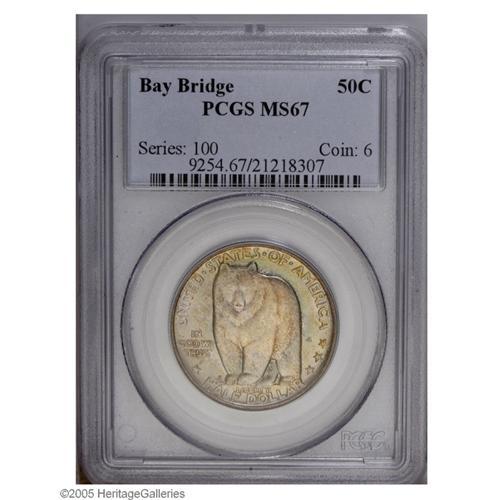 <B>1936-S<50C> Bay Bridge MS67 PCGS.</B></I> This Superb Gem has frosty silver luster beneath outstanding ivory, green, and gold toning. The reverse is mostly muted silver in color with evidence of toning only near the border. Population: 100 in 67, 9 finer (10/05).