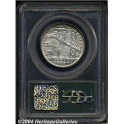 <B>1936-S<50C> Bay Bridge MS67 PCGS.</B></I> Apricot and powder-blue colors contribute to the eye appeal of this satiny and unabraded Superb Gem. The third and final appearance of the grizzly bear on a California-themed Silver Commemorative type. Encapsulated in a green label PCGS holder. Population: 84 in 67, 8 finer (3/04). <BR><BR><B>Important notice:</B> Heritage usually auctions material at the rate of 200-250 lots per hour. On some occasions eBay Live bid software or the Internet may not be able to keep up with the pace of the auction. We recommend placing a realistic absentee bid now as insurance to avoid disappointment. Occasionally the auctioneer may eliminate or reject an eBay Live bid, and the auctioneer may also reopen a lot after the close of the eBay live bidding (usually because we missed an audience bid), and may reject your bid even if it shows you as the winning bidder. By bidding via eBay Live, you agree that Heritage may award the lot to another bidder at its sole discretion under the circumstances described above or any other reasonable circumstances. Since eBay bids are not shown to us until we open the lot on the floor, we treat those bids just like floor bids. In most cases the floor responds before the eBay bid is presented to us, due to Internet lag time, so for consistency we have made it a policy that floor bids are always considered first over tie eBay live bids. Also please note that all Heritage lots purchased through eBay Live carry a 20% Buyer's Premium. Please make sure you read the Terms and Conditions before you bid. </span></font></tr></table></td></tr></table>