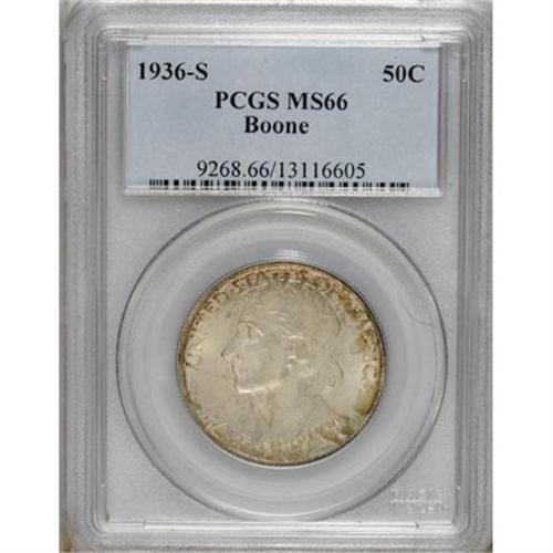 <B>1936-S 50C Boone MS66 PCGS.</B></I> PCGS Population (191/52). NGC Census: (205/17). Mintage: 5,006. Numismedia Wsl. Price for NGC/PCGS coin in MS66: $344. (#9268)<BR><BR><b>Shipping:</b> Coins & Currency (<a target="_blank" href="http://www.heritageauctions.com/common/shipping.php">view shipping information</a>)