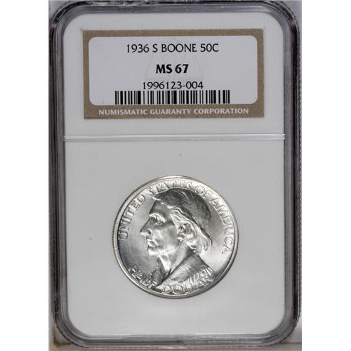 <B>1936-S<50C> Boone MS67 NGC.</B></I> A delightful Superb Gem with frosty, untoned surfaces. Almost every detail shows on this boldly struck coin. Census: 18 in 67, 1 finer (6/06).