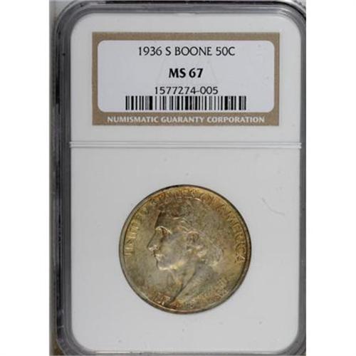 <B>1936-S 50C Boone MS67 NGC.</B></I> Lovely lime-gold and salmon-pink shades endow this shimmering and powerfully struck Superb Gem. Remarkably unabraded, and essentially unimprovable. Census: 16 in 67, 1 finer (8/07).<BR><BR><b>Shipping:</b> Coins & Currency (<a target="_blank" href="http://www.heritageauctions.com/common/shipping.php">view shipping information</a>)