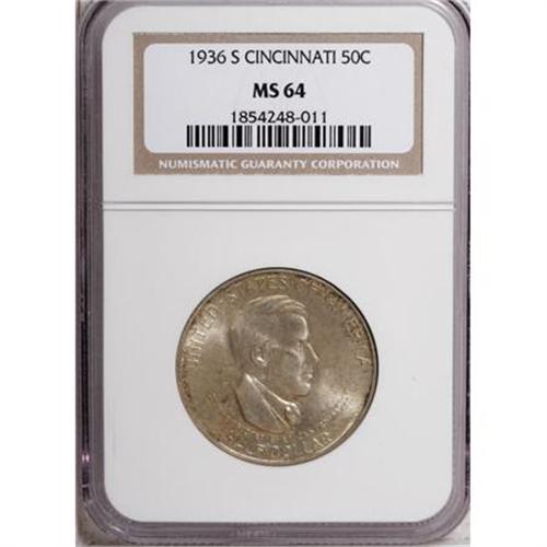 <B>1936-S 50C Cincinnati MS64 NGC.</B></I> NGC Census: (456/178). PCGS Population (608/273). Mintage: 5,006. Numismedia Wsl. Price for NGC/PCGS coin in MS64: $352. (#9285)<BR><I>From The Frank DuVall Collection of U.S. Commemoratives.</B></I><BR><BR><b>Shipping:</b> Coins & Currency (<a target="_blank" href="http://www.heritageauctions.com/common/shipping.php">view shipping information</a>\)