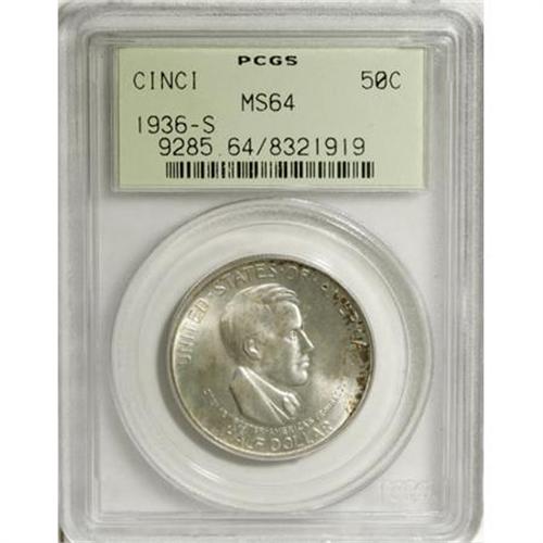 <B>1936-S 50C Cincinnati MS64 PCGS.</B></I> PCGS Population (614/273). NGC Census: (457/181). Mintage: 5,006. Numismedia Wsl. Price for NGC/PCGS coin in MS64: $352. (#9285)<BR><BR><b>Shipping:</b> Coins & Currency (<a target="_blank" href="http://www.heritageauctions.com/common/shipping.php">view shipping information</a>)