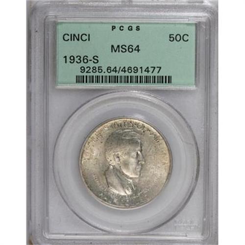 <B>1936-S 50C Cincinnati MS64 PCGS.</B></I> PCGS Population (613/273). NGC Census: (457/181). Mintage: 5,006. Numismedia Wsl. Price for NGC/PCGS coin in MS64: $352. (#9285)<BR><BR><b>Shipping:</b> Coins & Currency (<a target="_blank" href="http://www.heritageauctions.com/common/shipping.php">view shipping information</a>)