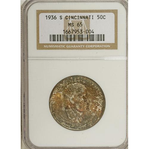 <B>1936-S 50C Cincinnati MS65 NGC.</B></I> The obverse of this frosty coin has dappled russet and periwinkle-gray patina, while the reverse has splashes of red at the periphery. Typically struck with surprisingly clean surfaces for the grade.<BR><BR><b>Shipping:</b> Coins & Currency (<a target="_blank" href="http://www.heritageauctions.com/common/shipping.php">view shipping information</a>)