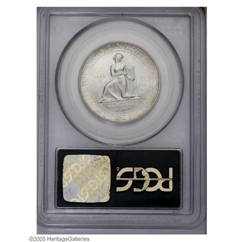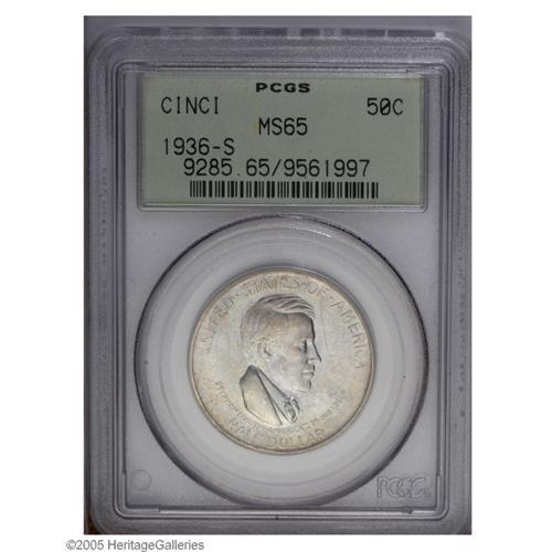 <B>1936-S<50C> Cincinnati MS65 PCGS.</B></I> A mix of pastel powder-blue and golden-brown patination blankets lustrous surfaces. Generally well struck throughout. Some small marks on Foster's cheek are mentioned for accuracy. PCGS has seen 37 coins grading finer (10/05).