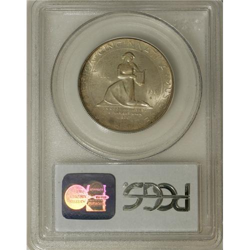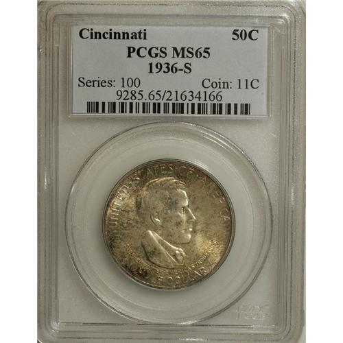 <B>1936-S 50C Cincinnati MS65 PCGS.</B></I> The low-relief initials of designer Constance Ortmayer are in such low relief as to be nearly indistinguishable on many specimens. Sprinkles of aqua, lavender, and gray are found in the peripheral areas of this piece, and are more apparent on the obverse. A few light contact marks are evident on both devices, but are in keeping with the grade. The C.O. initials are discernible, if not bold.<BR><I>From The Cary & Cheryl Porter Collection.</B></I><BR><BR><b>Shipping:</b> Coins & Currency (<a target="_blank" href="http://www.heritageauctions.com/common/shipping.php">view shipping information</a>)