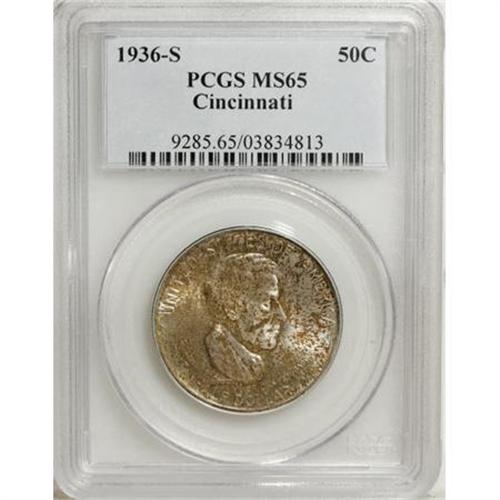 <B>1936-S 50C Cincinnati MS65 PCGS.</B></I> PCGS Population (223/50). NGC Census: (163/18). Mintage: 5,006. Numismedia Wsl. Price for NGC/PCGS coin in MS65: $650. (#9285)<BR><BR><b>Shipping:</b> Coins & Currency (<a target="_blank" href="http://www.heritageauctions.com/common/shipping.php">view shipping information</a>)