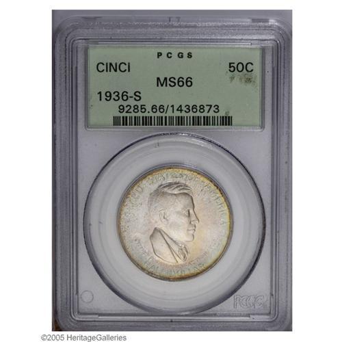 <B>1936-S<50C> Cincinnati MS66 PCGS.</B></I> Pastel green and yellow toning ring the peripheries, along with occasional speckles of russet. The design features are well defined, and the highly lustrous surfaces are immaculately preserved. Population: 36 in 66, 1 finer (10/05).