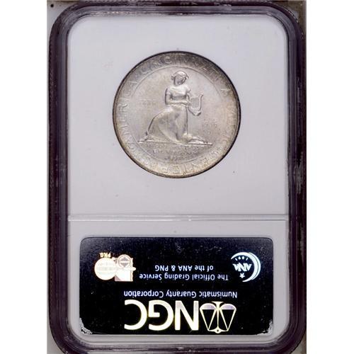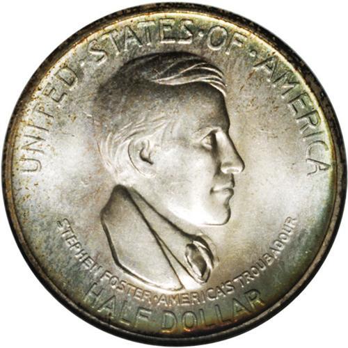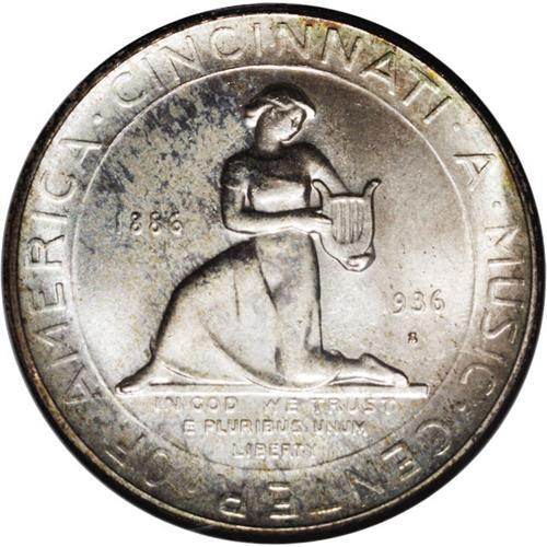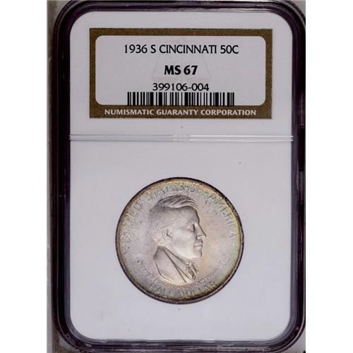 <B>1936-S<50C> Cincinnati MS67 NGC.</B></I> The 1936-S Cincinnati commemorative is relatively available through MS64, at which level NGC and PCGS combined have certified about 1,000 pieces. A little over 400 Gem and Premium Gems have been seen, but a scant 2 examples have been graded MS67, and none finer. The Superb Gem presented in this lot displays dazzling luster and pastel powder-blue, mauve, and beige-gold patina that is accented with deeper gold speckles. The design features are well brought up, and the surfaces are nicely preserved. A few minute, inoffensive marks on each side are mentioned solely for accuracy.