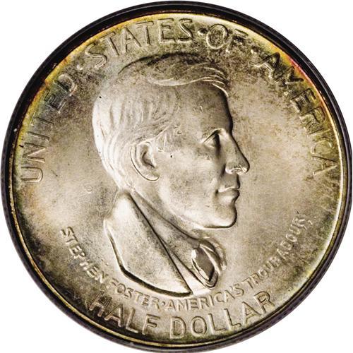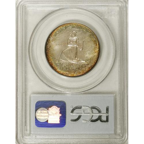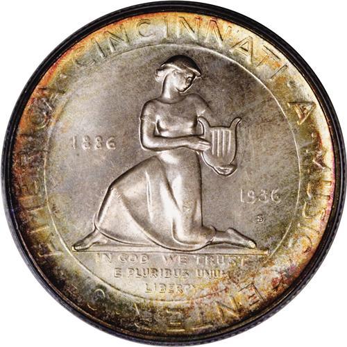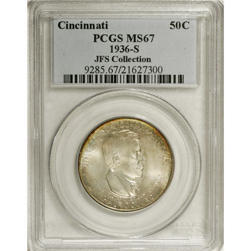 <B>1936-S 50C Cincinnati MS67 PCGS.</B></I> Ex: JFS Collection. The tiny mintages of the three Cincinnati issues amounted to just over 5,000 pieces each, all delivered into the hands of a single speculator, who also happened to be the distributor. The story of Thomas G. Melish, promoter extraordinaire, provided fodder for opponents of commemorative coinage, and many Mint policies that guide the work of the Mint and its advisory bodies derive from reactions to Melish's abuses.<BR> Though the Cincinnati coins encountered rough treatment at the various mints, a few escaped unscathed. A Heritage cataloger who described this coin in August 2004 focused on this coin's delightful colors, the "appealing pastels near the obverse borders, and luscious, vivid orange, yellow, olive, and crimson iridescence near the reverse peripheries." The silver-white centers shine, and the well-defined devices and nearby fields are surprisingly clean. NGC and PCGS have graded just one coin apiece at this level, with none finer at either service (3/07).<BR><I>From The Cary & Cheryl Porter Collection.</B></I><BR><BR><b>Shipping:</b> Coins & Currency (<a target="_blank" href="http://www.heritageauctions.com/common/shipping.php">view shipping information</a>)