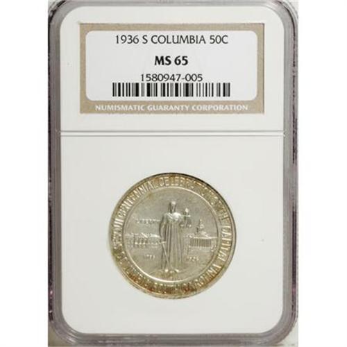 <B>1936-S 50C Columbia MS65 NGC.</B></I> NGC Census: (467/696). PCGS Population (631/519). Mintage: 8,007. Numismedia Wsl. Price for NGC/PCGS coin in MS65: $320. (#9293)<BR><BR><b>Shipping:</b> Coins & Currency (<a target="_blank" href="http://www.heritageauctions.com/common/shipping.php">view shipping information</a>\)