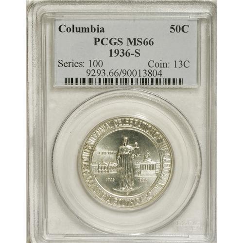 <B>1936-S 50C Columbia MS66 PCGS.</B></I> PCGS Population (446/75). NGC Census: (1142/238). Mintage: 8,007. Numismedia Wsl. Price for NGC/PCGS coin in MS66: $452. (#9293)<BR><BR><b>Shipping:</b> Coins & Currency (<a target="_blank" href="http://www.heritageauctions.com/common/shipping.php">view shipping information</a>)