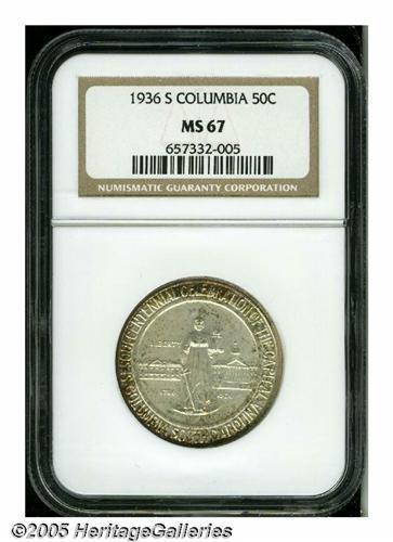 <B>1936-S<50C> Columbia MS67 NGC.</B></I> The design features are well impressed on this Columbia commemorative, and the peripheries, particularly on the obverse, are visited by golden-brown patina with reddish and greenish accents. A couple of trivial marks in the right (facing) reverse field are mentioned for accuracy. Population: 102 in 67, 6 finer (5/05).