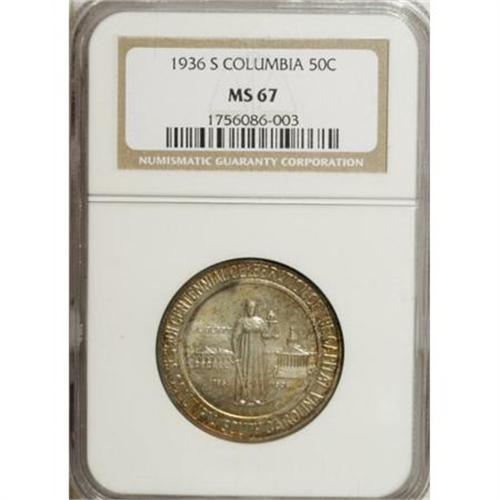 <B>1936-S 50C Columbia MS67 NGC.</B></I> Sun-gold, powder-blue, and apricot toning graces this lovely Superb Gem. Precisely struck with vibrantly lustrous surfaces. The fields and devices are essentially pristine. NGC has certified only six pieces finer (1/08).<BR><BR><b>Shipping:</b> Coins & Currency (<a target="_blank" href="http://www.heritageauctions.com/common/shipping.php">view shipping information</a>)