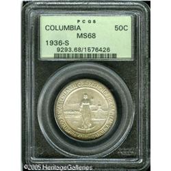 <B>1936-S 50C Columbia MS68 PCGS.</B></I> Not only technically finer to most Columbia Sesquicentennial Half Dollars (which are a cut or two above most other commemoratives to begin with), but the lightly toned surfaces display occasional flashes of burnt-gold and apple-green color at the margins that is extremely attractive. Lot:8474