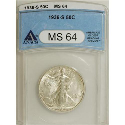 <B>1936-S 50C MS64 ANACS.</B></I> NGC Census: (359/571). PCGS Population (626/802). Mintage: 3,884,000. Numismedia Wsl. Price for NGC/PCGS coin in MS64: $220. (#6600)<BR><BR><B>Coin Engraver:</B> Adolph A. Weinman<BR><BR><b>Shipping:</b> Coins & Currency (<a target="_blank" href="http://www.heritageauctions.com/common/shipping.php">view shipping information</a>)